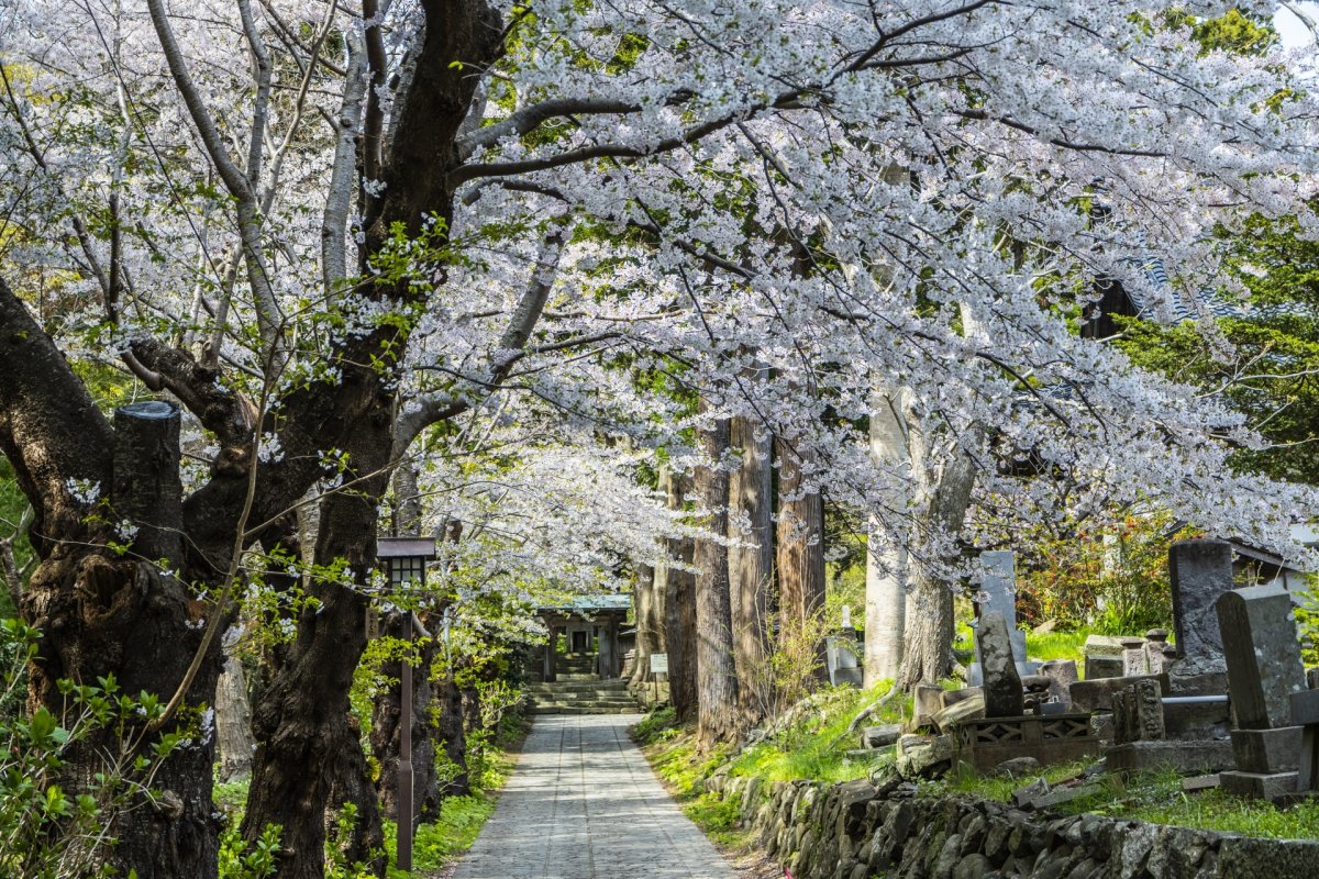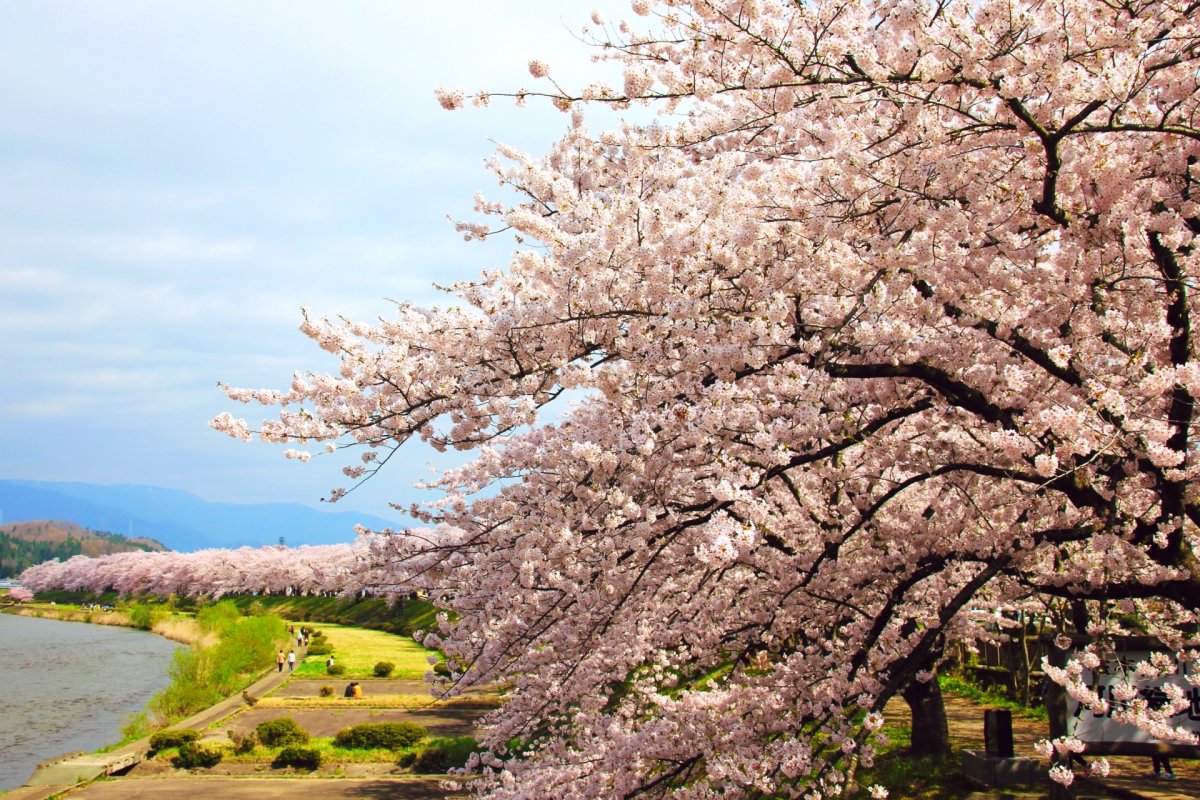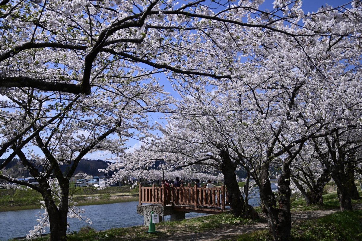昭和天皇のご生誕を記念して植えられたソメイヨシノが、堤防沿いに一斉に開花します。土手の緑と桜の淡い色が対比をなし、散策路を歩きながら頭上を覆う花の屋根を見学可能。隣接する武家屋敷通りのシダレザクラとともに、角館の歴史ある街並みを背景にした春の情景を多角的に鑑賞できる、国の名勝地です。