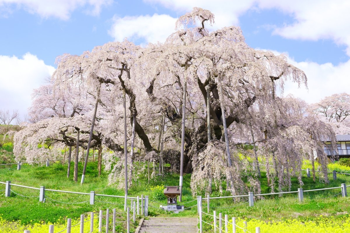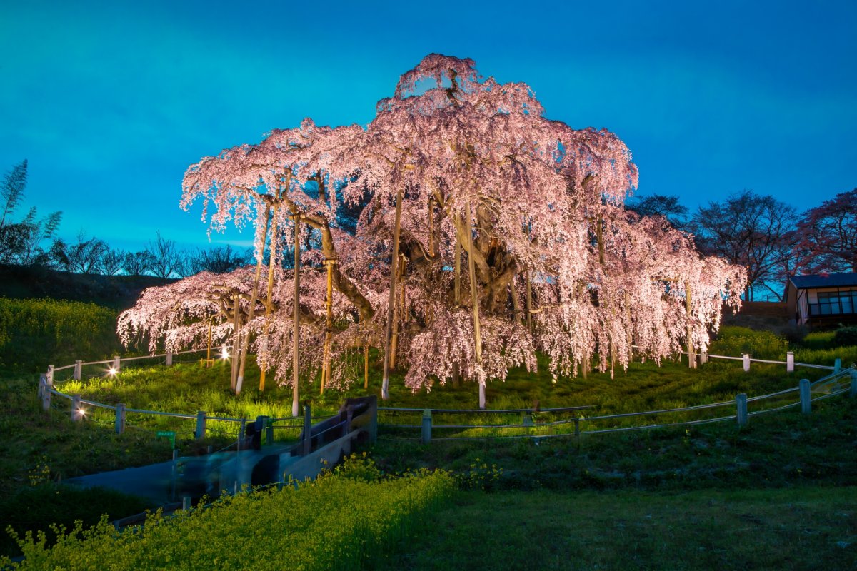 国の天然記念物に指定されているベニシダレザクラの巨木で、高さ13.5メートル、枝張りは東西南北に20メートルを超える圧倒的な構造を確認できます。周囲を歩きながら、どの角度からも歴史ある幹の曲線と薄紅色の花の重なりを観察可能。夜間にはライトアップも実施され、闇の中に浮かび上がる荘厳な立ち姿を鑑賞できます。