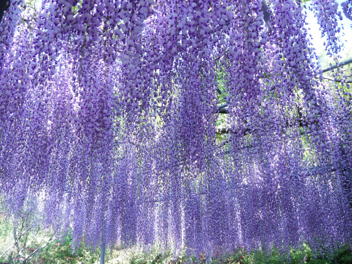 和気町にある藤の名所で、日本各地から集められた約100種類の藤が頭上を覆い尽くします。