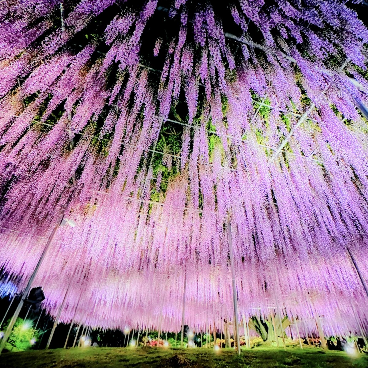 畳約600畳分にも及ぶ広大な藤棚から、1メートル以上に垂れ下がった藤の花が降り注ぐ様子を観察できます。夜間にはライトアップが行われ、闇の中に浮かび上がる花の密度と精緻な構造が強調されるのが特徴。世界からも注目される植栽技術により、頭上を覆い尽くす藤の色彩と香りに包まれる特別な体験が可能です。